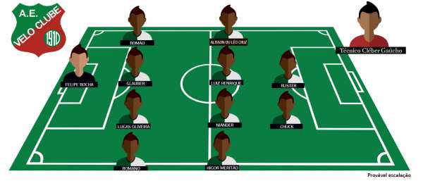Provável escalação do Velo: Felipe Rocha, Romão, Glauber, Lucas Oliveira e Romano. Alisson ou Leo Cruz, Luiz Henrique, Niander, Higor Meritão. Ruster e Chuck. O técnico é Cléber Gaúcho.