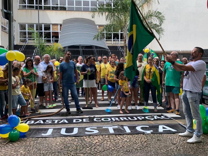 Integrantes do movimento Vem pra Rua e apoiadores de sua pauta de reivindicações realizaram uma nova manifestação na manhã deste domingo em Rio Claro. Vestidos de verde e amarelo e munidos de vassouras, os manifestantes lavaram o trecho da Praça da Liberdade, em frente ao Fórum, simbolizando a limpeza que desejam que aconteça no país.
