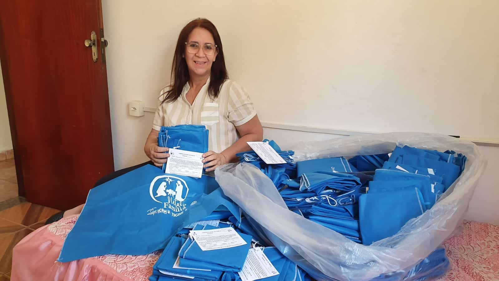 Todas as 1.200 sacolinhas foram confeccionadas a partir de um patrocínio da Tigre. que há mais de uma década também ajuda colaborando com uma festinha para mais de 350 crianças beneficiadas na campanha