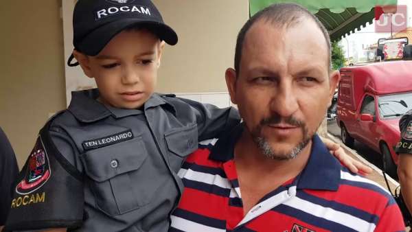 Emoção. O pequeno Leonardo Morbi de Godoy, que completou cinco anos de idade no sábado (6), foi surpreendido por uma ação da Polícia Militar de Rio Claro durante a sua festa de aniversário em Santa Gertrudes. Policiais da Rocam (Ronda Ostensiva Com Apoio de Motocicletas) chegaram de surpresa durante a comemoração no município vizinho para presenteá-lo com uma farda semelhante às usadas pelas autoridades da modalidade de policiamento.
