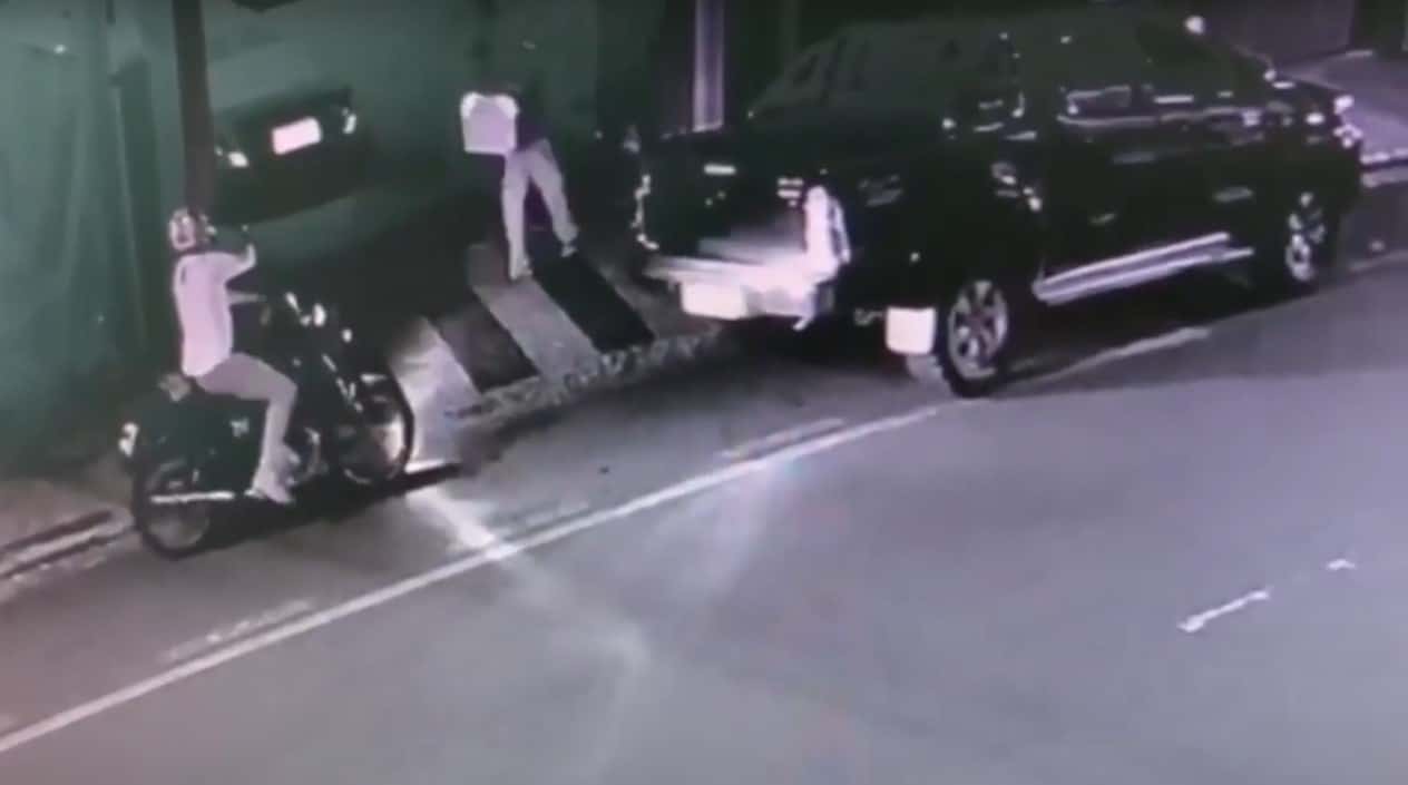 Na sequência da ação o comparsa que estava na moto sai do local enquanto o outro entra na caminhonete e fogem tomando rumo ignorado.