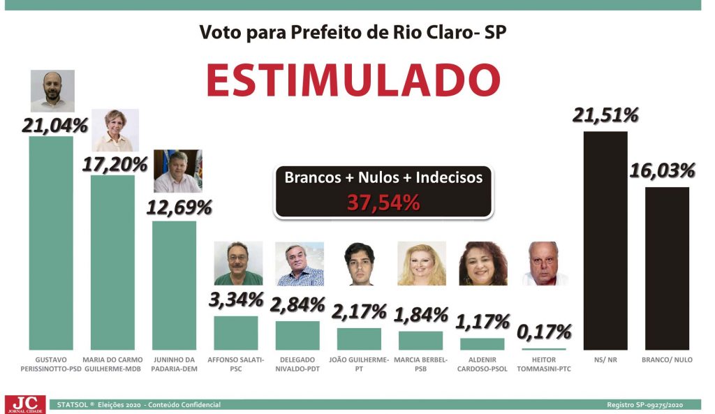 O candidato a prefeito de Rio Claro, Gustavo Perissinotto (PSD), aparece numericamente à frente dos adversários na pesquisa de intenção de voto encomendada pelo Jornal Cidade ao instituto Statsol e publicada neste sábado (14). Em seguida está a candidata a prefeita Maria do Carmo Guilherme (MDB) e o prefeito Juninho (DEM), candidato à reeleição. Quando comparada a margem de erro de 5% para mais ou para menos, os três candidatos aparecem tecnicamente empatados. O índice de indecisos pode levar a uma mudança no cenário até esse domingo, dia da votação.
