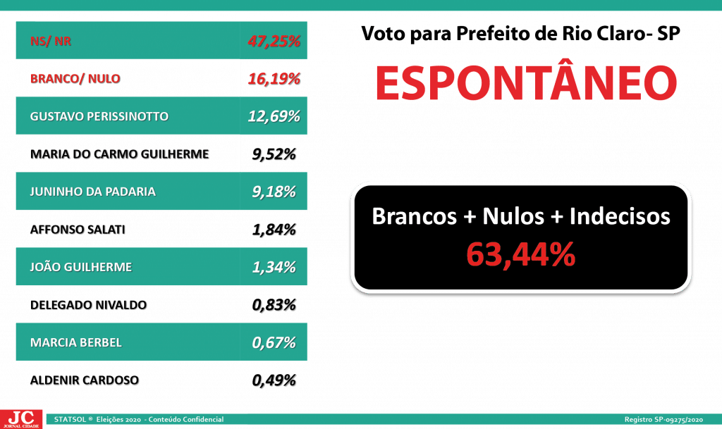 Neste levantamento, Gustavo Perissinotto (PSD) aparece numericamente à frente dos adversários com 12,69%, Maria do Carmo Guilherme (MDB) com 9,52% e Juninho (DEM) 9,18%. O mesmo índice de margem de erro é de 5% para mais ou para menos.