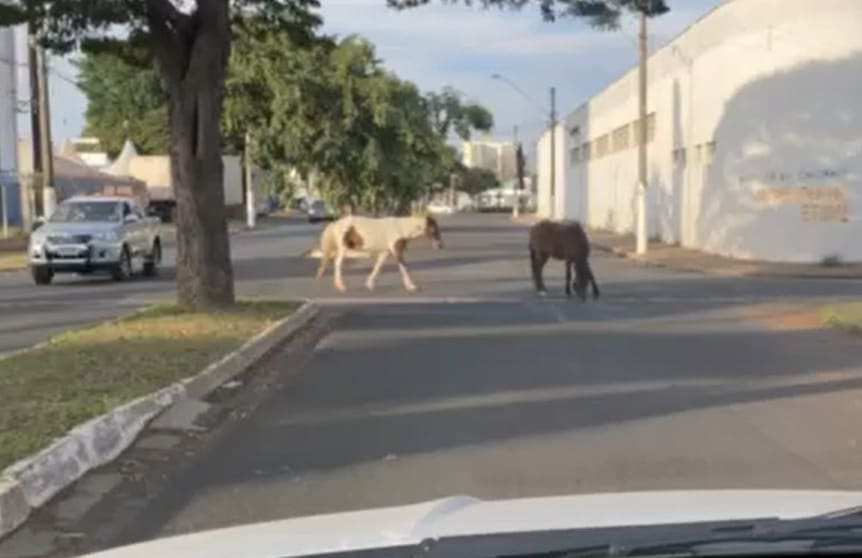 Dois cavalos foram flagrados “passeando” na tarde desta quinta-feira (5) na Rua 11 com a Avenida 29. Eles dividiram o espaço da via com carros e motos o que levou a um alto risco de acidentes.