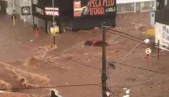 Nas imagens que circulam nas redes sociais é possível observar carros e diversos objetos e até mesmo uma estátua sendo arrastados pela chuva.