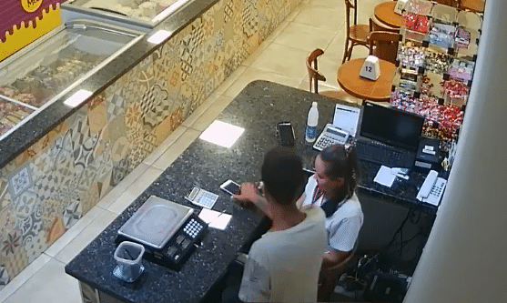 Imagens de segurança da sorveteria mostram a ação do criminoso (confira vídeo), que levou dinheiro do caixa do estabelecimento e o celular de uma funcionária. O roubo na farmácia não teve imagens divulgadas.