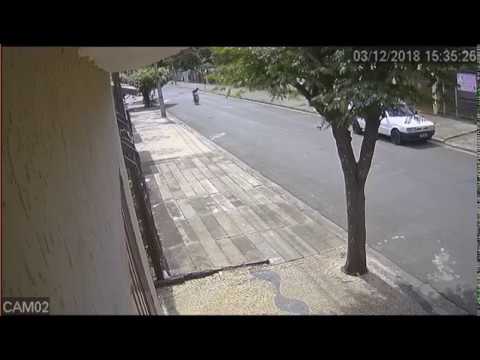 A câmera de segurança de uma residência filmou o ocorrido e mostra que após passar por uma lombada, uma peça se desprende da moto. Ao perceber, a vítima olha para trás e perde o controle da direção e bate contra a traseira de um veículo estacionado.