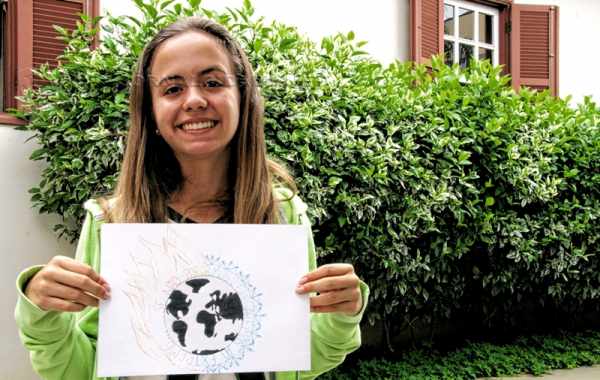 Alunos do Koelle produziram desenho sobre o ‘futuro do planeta’. Vitória Lucci exibe seu trabalho à reportagem