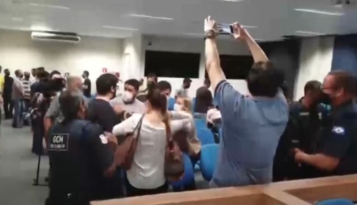 Ao final da sessão ordinária da Câmara Municipal, na terça-feira (3), é possível ouvir um homem xingando a publicitária Tássia Espego de “vagabunda”. Ela é assessora da candidata a prefeita Maria do Carmo Guilherme (MDB), enquanto o referido senhor é apontado como membro da campanha do prefeito Juninho (DEM) pela OAB Rio Claro, que em nota, manifestou repúdio à atitude registrada. Confira a nota na íntegra abaixo.