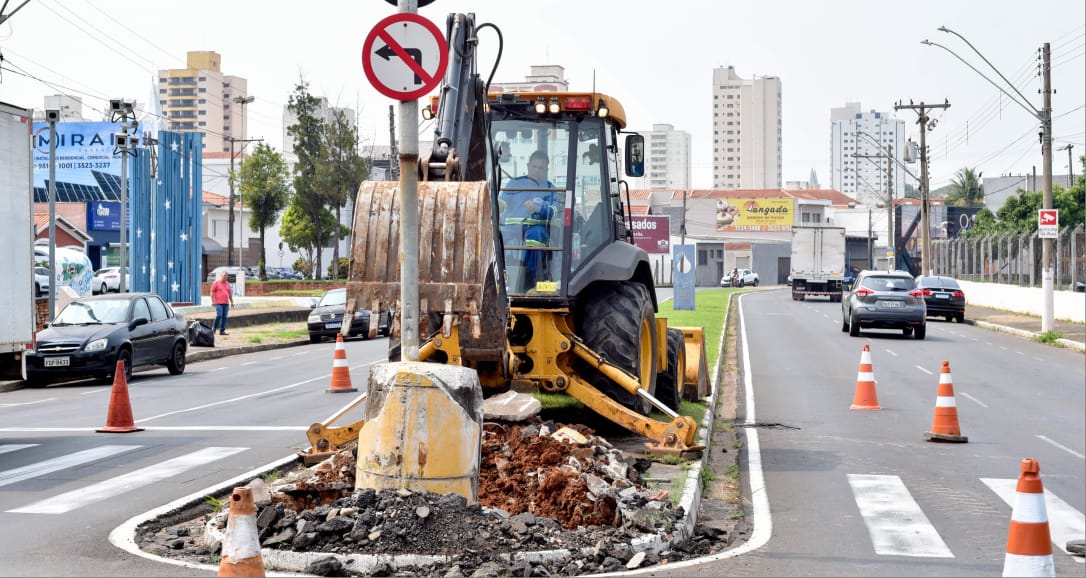 As obras no canteiro central da Avenida Rio Claro para instalação de ciclovia e retirada das antigas bases de sustentação dos semáforos prosseguem nesta sexta-feira e exigem cuidados por parte dos condutores de veículos. Máquinas pesadas, caminhões e trabalhadores atuam em vários locais, principalmente nos cruzamentos.