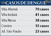 Em segundo lugar aparece a Vila Indaiá com 41 casos positivos seguido de Vila Nova com 38 notificações positivas, Centro com 35 casos e Jardim São Paulo com 23 casos (veja tabela abaixo).