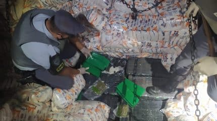 A quantidade de droga localizada foi 2523,600 kg de maconha e 12,3 kg de Skank.