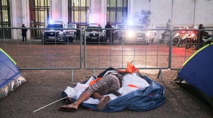 Parte das pessoas que vivem embaixo das marquises na capital paulista levou nesta terça-feira (7) suas barracas para a frente da sede da Prefeitura de São Paulo, no Viaduto do Chá, no centro, onde devem ficar acampados. Eles cobram do prefeito Bruno Covas (PSDB) ações efetivas que protejam a população mais vulnerável do novo coronavírus e do frio. Com a chegada do inverno, os termômetros têm marcado mínimas em torno de 10ºC e a Covid-19 já fez ao menos 28 vítimas entre os desabrigados -número que não dá a dimensão das mortes, já que só são registrados assim os casos informados pelas equipes de Consultório na Rua ou da assistência social. No fim de abril, Covas sancionou uma lei que permite que essas pessoas façam uso das vagas disponíveis em hotéis na cidade durante a pandemia. O custo das diárias sairia dos cofres municipais. Mas, após dois meses, não foi disponibilizada nenhuma vaga, segundo o Movimento Estadual da População em Situação de Rua. “Nós que estamos em situação de rua não queremos regalias e sim dignidade. Estamos aqui para solicitar a ajuda de todos para que possamos ter direito a saúde, alimentação e moradia digna. Não podemos permitir que nossos irmãos que estão em situação de rua morram de fome, de frio ou do coronavírus”, diz a carta dos movimentos estadual e nacional da população de rua. Eles querem que a prefeitura pare de retirar cobertores, barracas e objetos pessoais de quem vive nas calçadas; garanta atendimento que permita isolamento social, alimentação, condições para as higienizações e serviços de saúde; e contrate os quartos de hotéis previstos em lei. Também pedem que as estruturas de banheiro e chuveiro que foram instaladas por causa da pandemia na cidade se tornem permanentes, assim como a gratuidade no Bom Prato, o serviço de refeição a baixo custo do governo do estado. Eles reivindicam ainda melhores condições nos abrigos da prefeitura, que não dão conta da demanda -inflada com a chegada do vírus e das temperaturas baixas. Segundo a gestão tucana, o último censo mostrou que a população de rua na cidade chegou a 24.344 pessoas em 2019 -um salto de 53% em quatro anos. Mas os dados são contestados por movimentos sociais, já que pelo Cadastro Único, sistema do Ministério da Cidadania, em dezembro de 2019 havia 33.292 famílias em situação de rua no município. Seja um número ou outro, não havia vagas suficiente para todos dormirem nos centros de acolhimento mesmo antes da pandemia. A prefeitura divulga 17.200 lugares disponibilizados nos albergues, mas o déficit é ainda maior. Só cerca de 12 mil vagas são para pernoite, o restante é apenas para que a pessoa passe o dia no abrigo. São as chamadas “vagas dia”. Nas noites em que o censo foi realizado, 11.693 pessoas estavam nos albergues e 12.651 dormiam ao relento. Além da falta de vaga, os moradores de rua relatam ausência de estrutura nos prédios e de materiais para higienização. As camas são próximas uma das outras, os ambientes são insalubres, sem ventilação, que favorecem a propagação não só do coronavírus mas também de piolho, percevejos e doenças como a tuberculose. Na última semana, a primeira-dama do estado, Bia Doria, afirmou em um vídeo que não se deve dar comida ou roupa para essas pessoas porque, segundo ela, eles precisam saber que têm que sair da rua, um local que hoje, diz, é confortável para eles. “Falando dos projetos sociais, algo muito importante. As pessoas que estão na rua… Não é correto você chegar lá na rua e dar marmita, porque a pessoa tem que se conscientizar de que ela tem que sair da rua. A rua hoje é um atrativo, a pessoa gosta de ficar na rua”, disse Bia Doria. A mulher do governador João Doria (PSDB) é também presidente do Fundo Social de São Paulo, destinado a ajudar a população vulnerável.