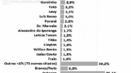 Pelos entrevistados são citados outros 75 nomes, todos com menos de 1%. Brancos ou nulos representam 6% e 36,1% dos entrevistados se declararam indecisos. Quase todos os vereadores que atualmente ocupam as cadeiras do Legislativo figuram entre os candidatos com maior intenção de voto, apenas José Luiz “Ratinho” (PMDB) aparece abaixo de 1%. Os demais são Glalson Chamon que concorre como vice-prefeito e Valério Joaquim Gaioto que não se candidatou.